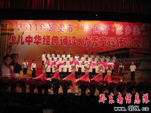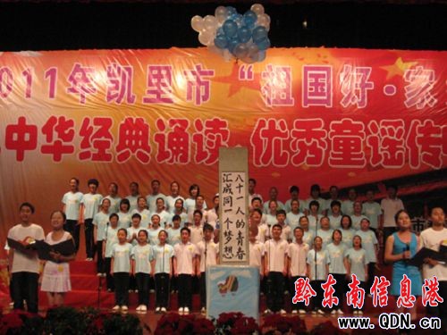 6月10日,2011年凱里市“祖國好,家鄉美”少兒中華經典朗誦、優秀童謠傳唱大賽在凱里市行政中心隆重舉行,全市13所小學,22所中學近1000名學生代表用朗誦、合誦、話劇、歌舞劇等豐富多樣的形式,為黨的90歲生日獻上了一份誠摯的祝福。
