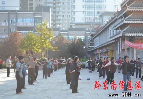 連日來秋雨綿綿,很多人都減少了戶外運動。昨日,天氣放晴,氣溫回升。許多中老年人今早紛紛走出家門,來到廣場扭秧歌、跳健身舞、練太極拳。圖為中老年人在凱里萬博廣場跳健身舞。(凌忠云)