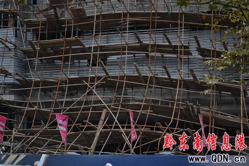 10月26日上午9點30分,記者接到市民爆料電話稱,凱里市文化北路世紀城靠近路旁用鋼管搭建的外裝修架子發生垮塌。