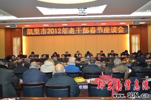 祥和喜慶迎新春,情真意切話發展。1月4日 下午,凱里市2012年老干部春節座談會在行政中心舉行。州委常委、市委書記黃遠良,州政協主席、市委副書記、市長洪金洲,市人大常委會主任龍興安,市政協主席潘詩權,以及凱里市其他四大班子領導與全市各企事業單位的離退休干部代表歡聚一堂,共迎新春佳節,共謀凱里發展。座談會由凱里市委副書記周文鋒主持。