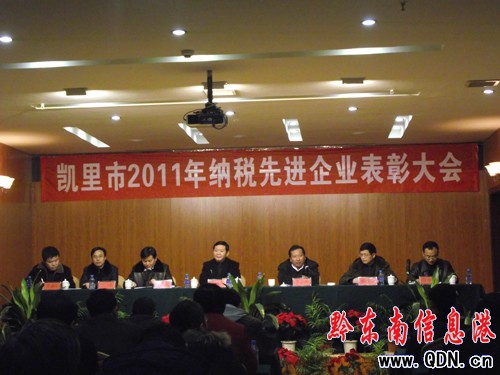 1月8日下午,凱里市在金凱酒店召開全市先進納稅企業表彰大會。對2011年度全市52家先進納稅企業進行表彰。市領導黃遠良、洪金洲、涂剛、楊建強、王智、周哲云、龍通良出席會議。會議由凱里市委常委、常務副市長涂剛主持。