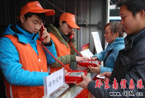 2月9日,凱里火車站青年志愿者在用座機為農民工免費電話訂票。