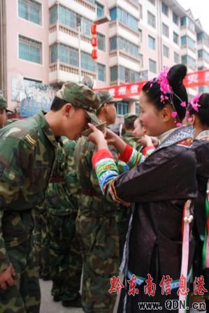本港訊 (特約記者 姚瑤 記者 姜秀波) 熱情好客的侗族少女端起香甜的米酒敬給親人解放軍,并獻上侗族尊貴的“連心帶”。3月4日,圓滿完成了搶修電網任務的成都軍區某紅軍師高炮團官兵離開革命老區貴州省