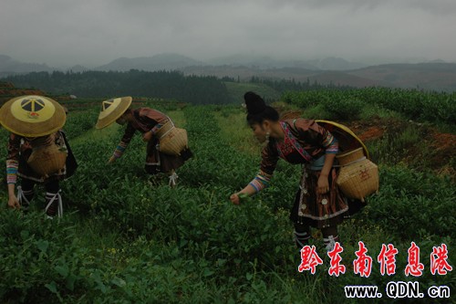 黎平縣是貴州茶園較集中連片的大茶區之一,茶園面積居黔東南之首,全縣已建成茶葉10.68萬畝,其中幼齡茶園3萬畝,投產茶園5.68萬畝。主要品種是龍井43號等四大品種,無性系品種占總數的85.9%。2010年茶葉總產量達2600噸,茶葉總產值2億元,分別比2009年增產240噸和增收1680萬元,受益3.2萬農戶,群眾增收9000萬元,解決農村8至9萬農村勞力就業。圖為侗族姑娘們在茶園里一邊唱歌,一邊摘茶的情形。(陸書明 攝影報道)