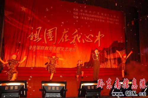 為熱烈慶祝中國共產黨九十華誕、紀念《中華人民共和國國防教育法》頒布十周年和《貴州省國防教育條例》頒布一周年,加強全民國防教育知識宣傳,營造全社會關心支持國防建設的濃厚氛圍,貴州省軍區國防藝術團(即貴州省國防教育藝術團)來到黎平演出大型專場國防教育節目“祖國在我心中”。此次觀演活動作為今年全縣軍地聯合開展國防教育的一項重要活動,黎平縣各鄉鎮、單位、學校把組織參與好此次觀演活動作為開展全民國防教育的一項重要政治任務來完成,組織干部、職工和師生觀看演出,達到了接受國防教育,陶冶愛國情操的目的。圖為演出現場。
