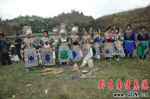 4月9日,在黎平縣九潮鎮高寅侗寨高寅弄坡、海拔高1200米的山頂上,有一個面積寬5畝的天鍋形水塘,全村1500名男女老少身穿盛裝,來到這里求雨,祈盼風調雨順。目前這個求雨節,已經開展了700年。