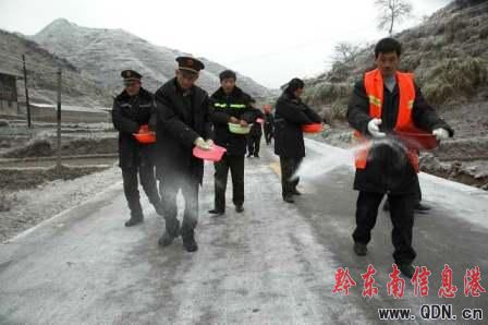 1月21日,全縣停電、斷水。居民生活物資和急救物資供應(yīng)告急。凱里公路管理局組織100多名公路工作人員,冒著寒冷天氣,在凱里市至雷山縣42公里長的308省道路面上灑鹽融冰,打通凱里至雷山通道,使大量物資運送到雷山。(嚴(yán)聲華 張輝 特約記者陳沛亮攝)