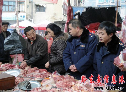 檢查工商執(zhí)法人員對(duì)縣城肉食市場(chǎng)