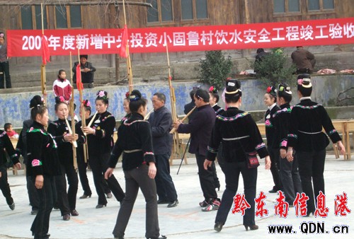 本港訊 (特約記者 張希才 攝影報(bào)道)“過去我們小固魯村為水愁,一到冬季小水井涸人畜飲水要到河里去挑,人們吃的是你在上面洗我在下邊挑的很不安全的水,感謝當(dāng)?shù)攸h委政府和水利部門的關(guān)心,興建了蓄水池,安裝了自來水管,將山泉引到各家各戶,現(xiàn)在擰開水龍頭,就能用上放心的安全水。”這是1月19日雷山縣丹江鎮(zhèn)小固魯村舉行2009年新增中央投資小固魯村飲水安全工程竣工驗(yàn)收典禮大會上,一位年近七旬苗族老人李茂林接受筆者采訪時(shí)高興地說。