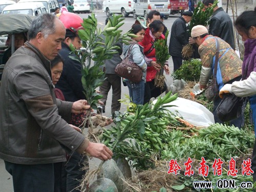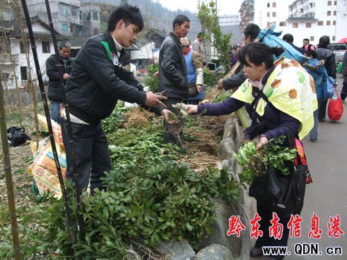 春節剛過,雷山縣各地農民仍然忙著趕集,他們利用縣城的趕集日,到苗木市場購買“嫁接”果樹苗。