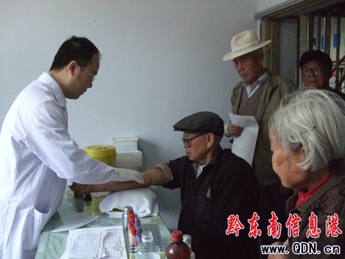 在中國共產黨成立90周年到來之際,中共雷山縣委離退休干部工作局為了讓離退休干部身體健康,多方籌措資金,于5月24日至25日,組織全縣42名離退休干部集中到縣醫院進行免費體檢。此次體檢包括化驗、尿常規、血常規、胸透視、彩色B超、婦科B超、心電圖、血壓等八個項目。圖為5月24日離退休干部接受醫生量血壓和抽血化驗的場面。(張希才 攝)