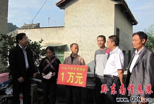10月18日,雷山縣人口計生局、丹江鎮(zhèn)政府和響樓村村兩委的相關(guān)人員將10000元一次性二女戶絕育獎勵金送到丹江鎮(zhèn)響樓村一組楊洪明、楊燕芬夫婦手中,并與該夫婦親切交談,深入了解該夫婦的生產(chǎn)、生活中存在的困難,了解大女兒在學(xué)校的學(xué)習(xí)情況,勉勵該夫婦放開思想包袱,勤勞致富,一定要把兩個女兒教育好、培養(yǎng)好。