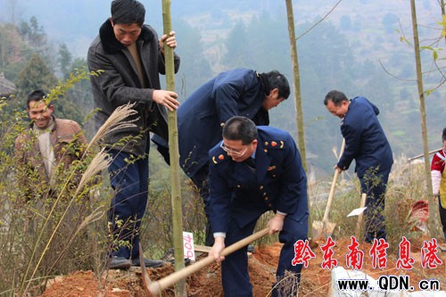 在該縣城郎當河口至烏秀環城公路綠化區,大家沐浴著柔和的陽光,迎著醞釀泥土與花草芬芳的春風,大家相互配合,把一棵棵載著希望的樹苗植入土壤。挖坑、植苗、填土、踩實,鍬聲、鋤聲、歡笑聲,植樹現場到處是一片熱火朝天的忙碌景象,體驗著勞動的快樂。該縣工商局經過近一天的勞動,共種植樹苗20余棵。為綠化美化雷山新添了一抹新綠。