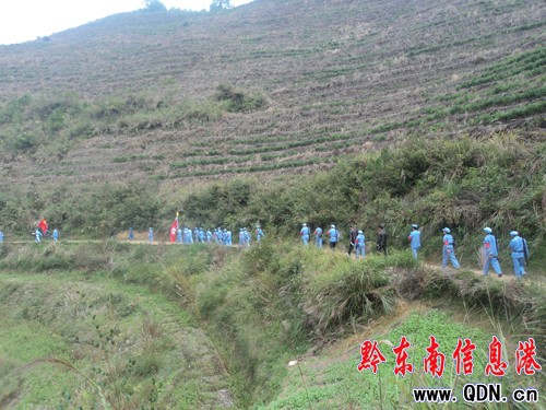 本港訊 (韋運(yùn)安 特約記者 唐學(xué)章 攝影報(bào)道)今年是中央紅軍長(zhǎng)征進(jìn)入侗鄉(xiāng)黎平76周年。為弘揚(yáng)紅軍長(zhǎng)征精神,加強(qiáng)國(guó)防教育、愛國(guó)主義教育和革命傳統(tǒng)教育,推進(jìn)“踐行宗旨教育”及創(chuàng)優(yōu)爭(zhēng)先活動(dòng),建設(shè)美好的侗鄉(xiāng)革命老區(qū),10月22日,中共黎平縣直屬機(jī)關(guān)工作委員會(huì)組織62名支部書記、黨員和入黨積極份子,開展一次重走紅軍長(zhǎng)征路活動(dòng)�;顒�(dòng)線路是當(dāng)年紅軍長(zhǎng)征戰(zhàn)斗經(jīng)過的中潮鎮(zhèn)佳所村——平壩村——羊角巖——德鳳鎮(zhèn)汪家莊——黎平縣城,其中羊角巖是紅軍戰(zhàn)斗遺址。