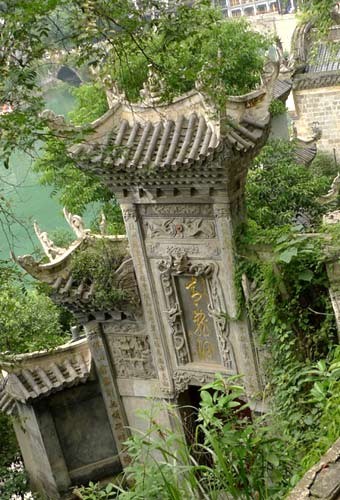 古鎮的建筑是古樸的,而水是綠得晶瑩,充滿了誘惑。我眼見一個女孩子跳了進去,快樂地游起來。于是我也有想把相機放在一邊跳下去的沖動。水岸的一邊是有些小資味道的客棧,另一邊是歷史悠久的青龍洞。說起這青龍洞還挺搞笑的,是以和諧為主題的,道教佛教以及儒家都在洞里面供奉,以和諧相處自豪,以這種姿態笑傲華夏。