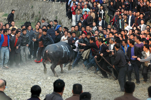 據(jù)目擊者介紹,當日是一年一度的舟溪蘆笙會最熱鬧的一天,按照慣例,參加斗牛比賽的水牯牛將在甘囊香蘆笙堂河灘壩邊輪番登場進行比拼。下午3時許,兩頭剽悍的水牯牛登場后,便廝打起來。數(shù)以萬計的觀眾,有的站在河壩上遠觀,有的則圍攏在河灘邊近觀。