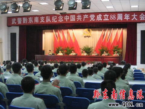 本港訊 (陶云生 本港記者 周亮 攝影報道)“我志愿加入中國共產黨,擁護黨的綱領,遵守黨的章程,履行黨員義務……”。7月1日,鏗鏘的誓言在武警黔東南支隊大禮堂久久回蕩。為紀念中國共產黨成立88周年和表彰先進基層黨組織、優秀共產黨員和優秀黨務工作者,武警黔東南支隊機關及受表彰人員和駐凱里城區部隊官兵歡聚一堂,共同紀念黨的88歲生日。