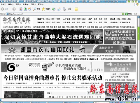 本港訊 (記者 楊懿)今天,全國為舟曲特大山洪泥石流災害遇難同胞舉行哀悼,這是我國繼2008年汶川大地震哀悼日之后的第三個“平民哀悼日”。黔東南州主流網絡媒體黔東南信息港及黔東南州人民政府網首頁都采用肅穆的黑白色調,哀悼全天。