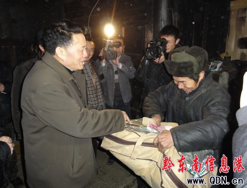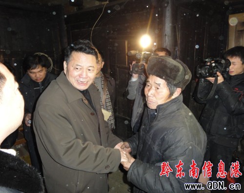 下午3時,一路風塵仆仆的王正福主席一行26人來不及休息,就在往洞鄉政府會議室組織縣、鄉、村干部召開了扶貧產業發展座談會,詳細了解往洞鄉十一五取得的成績及十二五發展規劃,就省政協掛靠幫扶往洞鄉的工作開著熱烈的討論和座談。座談會結束時,已是下午5時,王正福主席一行兵分四路立即驅車前往托苗、高傳、信地、增盈村看望慰問貧困群眾。此時室外溫度降到了零下2度,寒風夾雜著小雨,刺骨的冷,村道更是泥濘濕滑難行。王正福主席首先來到了托苗村烈屬甘茂生家,圍在火塘邊與甘茂生拉起了家常,當了解到甘茂生的大兒子在自衛反擊戰中英勇犧牲時,他動情的說:“你培養了一個好兒子,這是你的驕傲,也是我們的驕傲。”臨走時,王正福主席親手將慰問金和棉衣棉被等慰問品交給了甘茂生。五保戶陳老新的住房低矮破舊,只有不到9平方米,大門不足1米高,臥室和廚房混在一起。王正福主席看到后心情十分沉重,他問陳老新蓋的被子暖和不暖和?兩市夠不夠吃?有沒有棉衣過冬?有沒有錢準備年貨?隨行的鄉村干部說這些困難已經解決了,并利用危改項目正在修建新的住房。王正福滿意的說:一定要把困難群眾的生活安排好,要讓每一個群眾都不受凍,不挨餓。當陳老新從王正福主席中結果慰問金和棉衣棉被等慰問品時,熱淚盈眶的連連說:感謝黨!感謝黨!