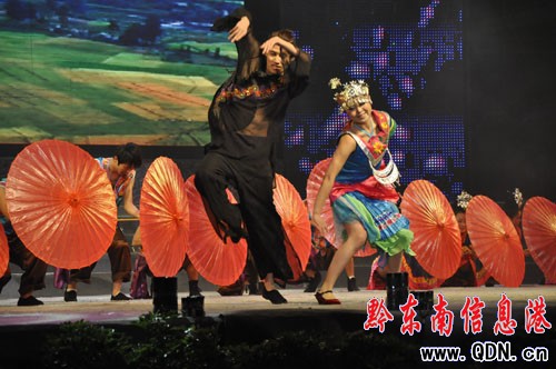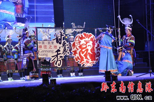 開(kāi)幕式隨后舉行了大型苗族歌舞詩(shī)畫——《甘囊香》的精彩演出。整場(chǎng)演出分為《序》和《神秘甘囊香》、《守望甘囊香》、《多彩甘囊香》、《歡聚甘囊香》四個(gè)部分,表現(xiàn)了苗族人民對(duì)神往之地的向往和對(duì)明天美好生活的渴望之情。