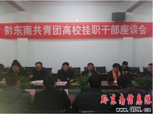 在來至廣東省10所高校、省內5所高校的16位團干部即將結束為期一年的掛職工作之際。2012年1月9日,團州委在凱里召開了黔東南共青團高校掛職干部座談會,州委副書記楊華昌、州委常委、州紀委書記張文強、州政協副主席梁承祥、州委副秘書長吳隆文、州委教育工委書記、州教育局黨組書記楊德敏、團州委書記羅祖新、州教育局副調研員滿維標等領導出席座談會,各縣市團委負責人、團州委機關全部干部參加本次座談會,座談會由團州委書記羅祖新主持。