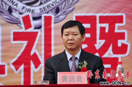 黃遠良在在駐兵儀式上致賀詞,他首先代表開發區工委、管委向消防中隊營房的落成表示熱烈的祝賀,向長期戰斗在第一線的全體消防官兵致以誠摯的問候和崇高的敬意,向關心和支持凱里經濟開發區消防工作的各單位、社會各界人士表示衷心的感謝!