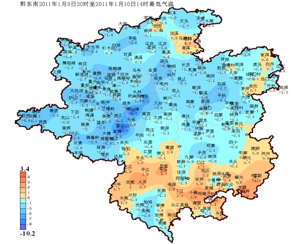 9日夜間到10日白天,受高空槽和冷空氣補充影響,全州各地陰轉雨夾雪,氣溫下降,截止10日14時,全州183站點最低氣溫在0℃以下,城區除榕江、從江、岑鞏、施秉、鎮遠在0℃上以外,其余在0℃或0℃以下,麻江-3.9℃最低,凱里-2.5℃。部分鄉鎮、公路鐵路沿線和旅游景點最低氣溫情況:雷公山-10.2℃、紅陽草場-9.7℃、方召-6.2℃、雷榕公路排里坳-5.3℃、西江-4.1℃、楊柳塘-3.5℃、臺烈-3.0℃、天馬-2.7℃,低溫區集中在州中部及其以北地區,低溫中心在苗嶺西南段的地勢高處(圖1)。凱里、雷山、丹寨、黎平出現新的電線積冰,麻江電線積冰直徑35mm最大。