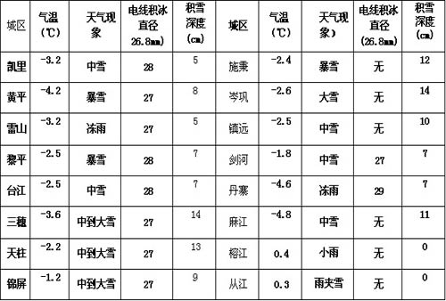 據19日08時監測,我州除丹寨、雷山凍雨、榕江小雨外,黃平、施秉、黎平暴雪,其余中到大雪,電線積冰由18日20時4縣增加到10縣市。電線積冰直徑最大丹寨29mm,道路結冰、電線積冰范圍擴大,除榕江、從江外,其余積雪深度5cm以上,其中三穗、天柱、施秉、岑鞏、麻江超過10cm,三穗最大14cm(圖1)。城區氣溫:榕江、從江在0℃以上,其余在0℃以下(表1);部分鄉鎮、公路、鐵路、機場沿線和旅游景點氣溫:雷公山-2.1℃、紅陽草場-6.0℃、方召-6.6℃、雷榕公路排里坳-5.6℃、滾馬-5.5℃、西江-4.4℃、楊柳塘-4.8℃、臺烈-4.0℃、天馬-4.8℃、高釀-3.2℃、高屯-2.1℃。全州最低氣溫分布見圖。