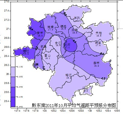 1、總趨勢:我州各地月平均氣溫與歷年同期平均值比較略偏低,月降水量與歷年同期比較略偏多;10月中下旬有5天左右秋綿雨天氣,較常年同期為正常,(秋綿雨為日降雨量≥0.1毫米,并持續5天以上)。