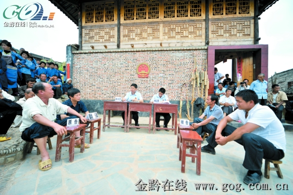 屋檐下,擺放著原告、被告、審判員和書記員席位,身后木墻上國徽熠熠生輝。6月1日,榕江縣法院在樂里鎮本里村二組審理一起相鄰權糾紛案,現場簡易卻很莊嚴。