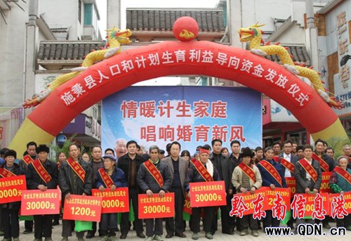 為貫徹落實好省委、省政府關于全面加強人口和計劃生育工作確保實現雙降目標的意見和州委、州政府實施意見精神。3月18日,施秉縣隆重舉行人口和計劃生育利益導向資金發放儀式。儀式現場,48位計生受益代表領取了相應的人口和計劃生育利益導向資金。