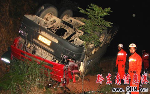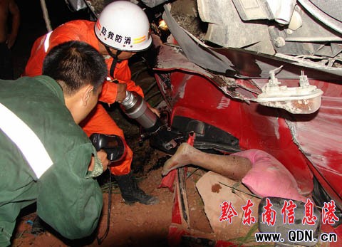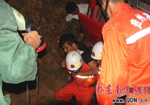 本港訊 (劉世健 特約記者 張正特 攝影報道)7月13日凌晨2時許,一輛運送水泥的槽車在黎平縣肇興距縣城16公里處發生側翻,車上一人被壓在車門下。當地6名消防官兵隨后與急救醫生一道火速趕往現場救援,利用液壓鉗、鐵鍬和鋤頭等工具,輪番上陣。經過40多分鐘的艱難營救,成功將被困男子救出送往醫院。