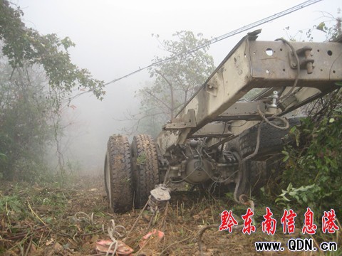 12月2日,記者路經(jīng)事故現(xiàn)場。當(dāng)天的霧很大,10余人在大霧中努力作業(yè)著。記者看見,大卡的貨箱和車頭已經(jīng)分離,貨箱已被吊出,工作人員正在吊貨箱支架,在100余米深的樹林下面,大霧中車頭隱隱可見。