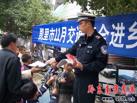 本港訊 (記者 劉仙)為切實加強農(nóng)村交通安全宣傳教育工作,有效預防和遏制農(nóng)村道路交通事故的發(fā)生。增強農(nóng)民群眾的自我保護和防范意識,為農(nóng)村群眾出行創(chuàng)造安全暢通的交通環(huán)境。2009年11月,凱里市交警大隊組織民警深入鄉(xiāng)鎮(zhèn)開展交通安全宣傳活動,不斷加大農(nóng)村交通安全宣傳工作力度。