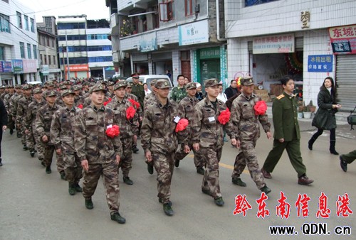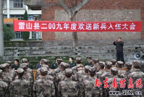 本港訊 (特約記者 張希才 攝影報道)12月15日,雷山縣一批新兵啟程赴廣州軍區。當日上午8:30,雷山縣在縣委球場隆重舉行2009年新兵入伍歡送儀式,43名(其中女兵1名)新兵告別故鄉啟程,奔向新的生活。