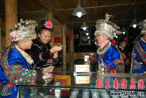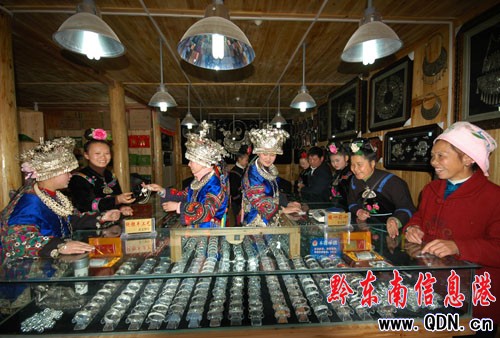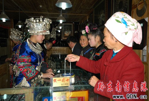 本港訊 (李玉貴 特約記者 唐光新 攝影報道)居住在貴州省雷山縣的苗族,每一戶苗家人幾乎家家都有銀裝的收藏。每逢苗年節,苗家女子盛裝披銀,項戴數個婁花銀項圈淹沒嘴鼻,胸前配掛重大銀鎖,腕間攜戴數對不同樣式的銀手鐲,她們要比試誰的銀裝最重,誰的最大,誰的最多,獲勝者將會成為蘆笙場上所有小伙子追逐的目標。圖為苗家女在選購銀飾品。