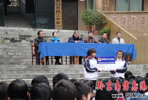本港訊 (文 博 特約記者 張希才 攝影報道) 2010年“元旦”期間,為進一步加大對“黑網吧”的查處取締力度,做到“早發現”、“早制止”、“早取締”,切實保護青少年的身心健康,雷山縣工商局與縣文體局、縣教育局聯合開展“黑網吧”監督舉報進校園活動,在丹江小學、雷山二中、西江中學等21所中小學校舉行“黑網吧”舉報授牌活動。圖一:在西江中學授牌;圖二:在丹江小學授牌。