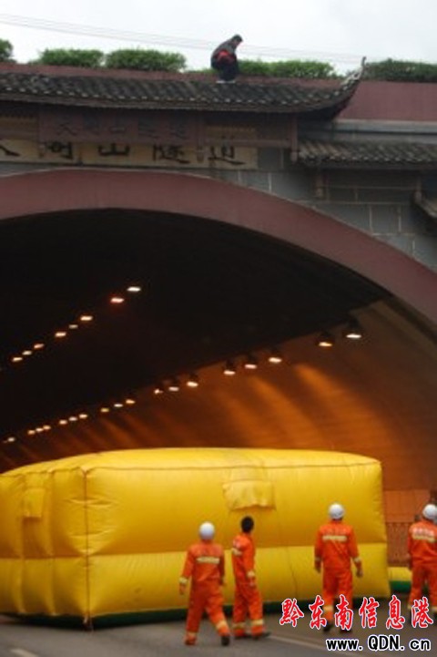 記者目測,瓦閣與地面的垂直高度約10米,如果該男子不幸失足,那非死即傷。為防止該男子突然失足造成嚴重后果,凱里交警中斷了大閣山隧道的交通,另一撥消防官兵便在路面上鋪設了救生氣墊。