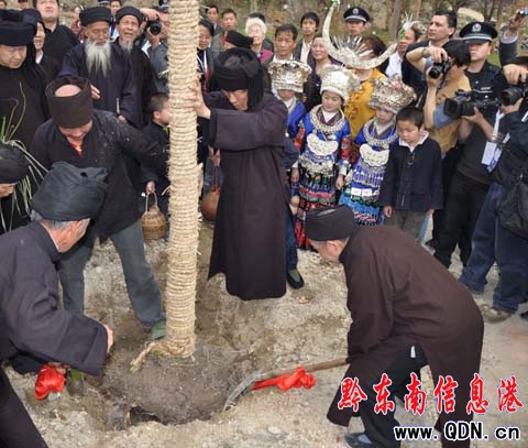 本港訊 (通訊員 楊貴平 記者 廖強 楊驥 李麗娟 攝影報道)3月22日,西江苗寨的舉行了盛大的“世博林”種樹儀式,通過栽種“護寨樹”向前來參加上海世博會·西江論壇的來賓們展現(xiàn)了苗家特有的種植文化。