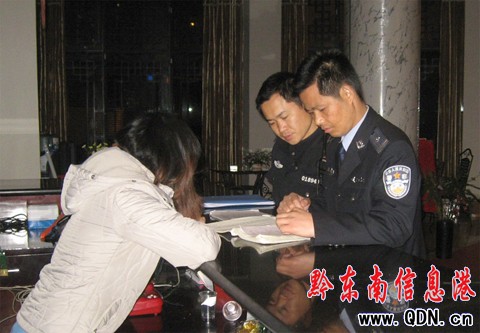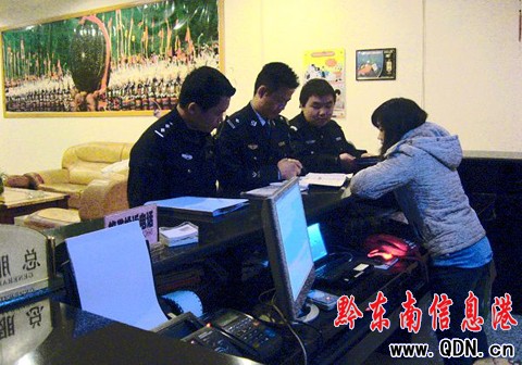 本港訊 (吳超榮)4月上旬以來,雷山縣公安局加大對縣城關地區網吧、旅店業的執法檢查力度,強化對網吧、旅店業等場所的管理,切實增強公安機關對互聯網的管控能力和有效遏制未成年人上網、不攜帶身份證入住旅店等安全管理和經營管理上存在的漏洞。圖為民警在檢查旅店業前臺登記情況。