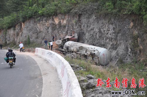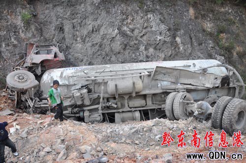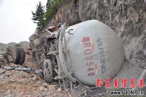 記者趕到現場時,凱里交警正在處理。公路邊的防護欄留有深深的印痕,據知情者說,這是車輛翻下去時留下的。水泥罐車是廣東牌照,車頭已經嚴重變形,擋風玻璃全部破碎,前后兩排車輪都脫離車身,車頭下面落有兩床棉絮,車尾灑滿了水泥。