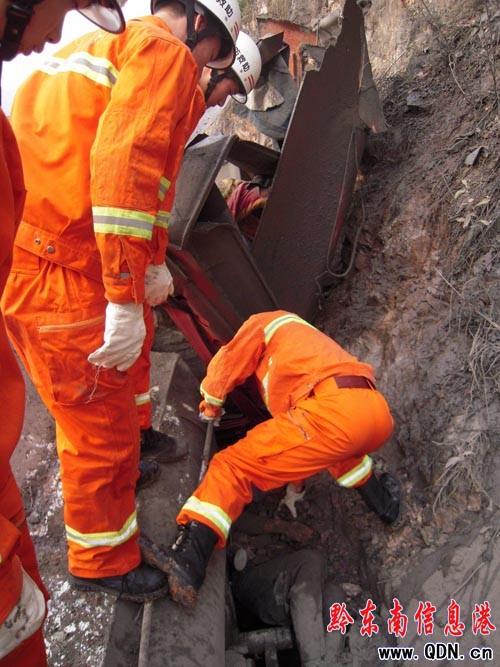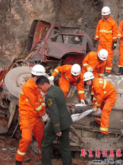 7時30分許,凱里消防趕到了現場。消防官兵偵查發現,司機被卡在了車身與石壁之間,被水泥掩埋了。隨后,一名消防隊員主動請纓“鉆”進車下,利用雙手刨開掩蓋司機的水泥 ,把司機拉了出來,但司機因傷勢過重已經死亡。