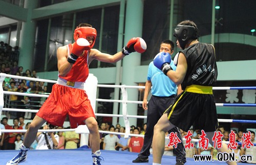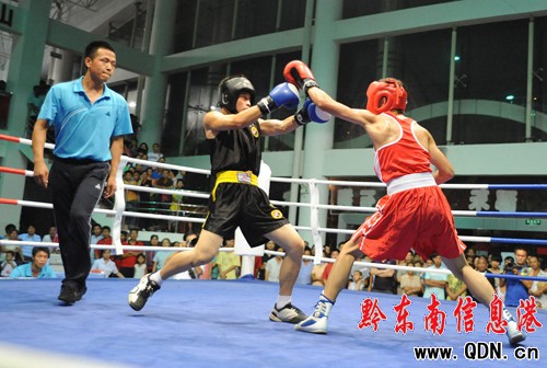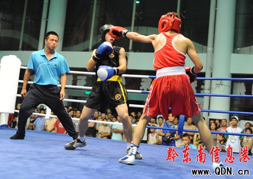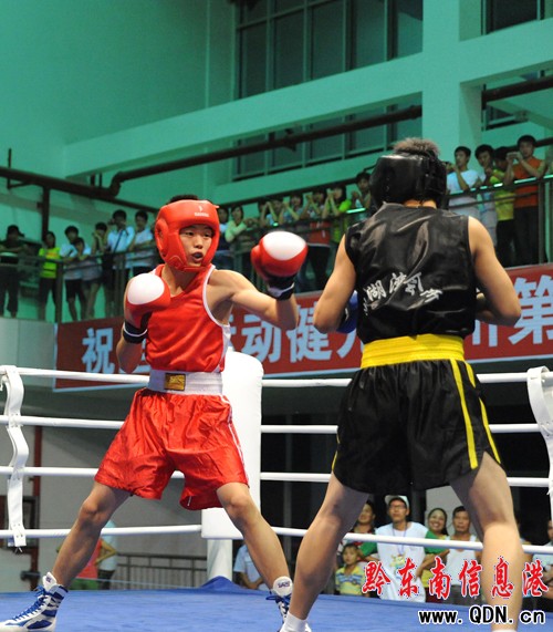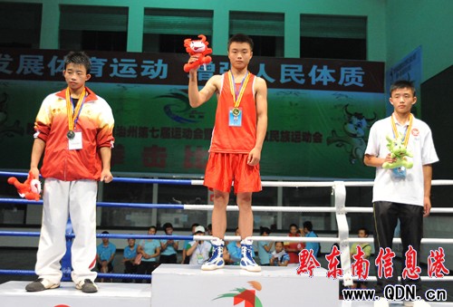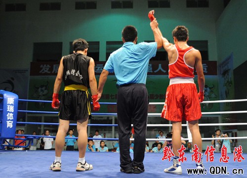 本港訊 (特約記者 黃曉海 攝影報道)7月25日,在凱里市城南客車站進行的七運會拳擊決賽中,丹寨選手張輝凱在54公斤級的比賽中擊敗黎平縣選手,為丹寨代表團奪得首枚金牌。