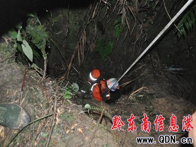 消防官兵于03時10分,到達現場。消防官兵在對周邊的情況進行偵察后,得知這是一個長年被雨水沖刷流入而形成的天然的洞穴,據村民說,這洞穴深有百米多,其洞口很小,周圍都是布滿雜草、樹丫。