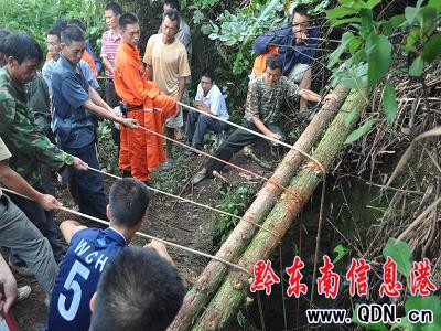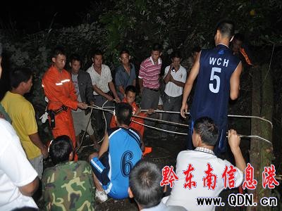 得知情況后副指導員韋叢和迅速召集,公安派出所長、村長、120負責人成立了現場臨時救援指揮部,指揮員迅速做出救援部署。一是村長帶領村民,砍伐洞穴周圍的雜草,樹枝,在洞口開辟一個救援平臺,并在洞上面架起兩根大木頭以備作固定支點用。二是消防官兵充當救援突擊隊,由一名經驗豐富的救援人員攜帶安全繩,對講機,照明燈,導向繩,佩戴空呼器下洞偵察,并隨時向指揮員報告洞內情況。三是公安派出所長帶領民警負責警戒,保護,并同時要求120做好相應的準備。