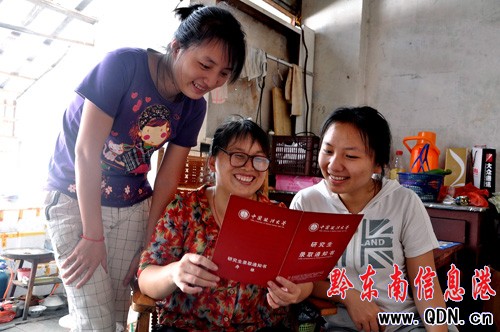“今年,我家真是雙喜臨門,大妹崽(當(dāng)?shù)啬赣H對(duì)女兒的昵稱)被中國(guó)政法大學(xué)錄取為研究生,小妹崽又考取了華中科技大學(xué)。我雖然很辛苦,但值得。” 饒德玉噙著淚說,兩個(gè)女兒很聽話,又肯讀書,從不講究吃穿,只要她們倆肯讀下去,我再苦再累甚至賣房子都要供她們。