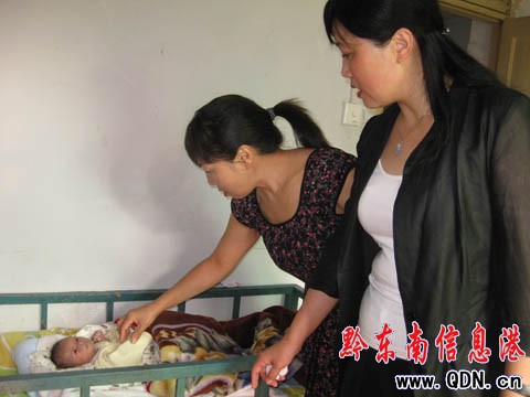州婦聯主席正在看一個被丟棄的患有丙干的棄嬰