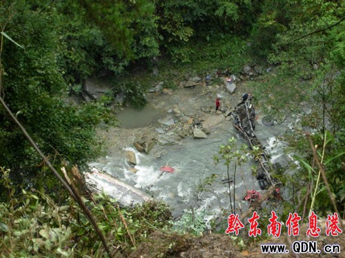 本港訊 (張榮 特約記者 陳沛亮 攝影報道)2010年10月14日10時許,一輛運載散裝水泥的槽罐車由貴州省凱里市往榕江縣方向行駛,行駛到雷山縣桃江鄉境內的省道黎爐線184公里加200米處時,槽罐車沖出公路 , 翻下100余米高坎 ,墜入河谷,造成車內司乘人員兩人當場死亡,車輛報廢。事故原因尚在調查中。