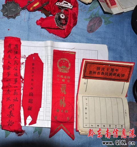 “這是我自己采摘的茶葉,自己加工的,你們嘗嘗。”走進朱學興家青瓦紅磚的小樓房里,話音甫落,慈祥的老人便端來了水果和茶水。老人健談又樂觀,從她年輕的歷程說到今天的生活,笑聲不斷。當談到她當年上北京的那段親身經歷時,老人對每個細節都記憶如新,甭提有多興奮,心里樂滋滋的。“看看,這些是我當年參加國慶10周年慶典的時候得到的,我一直珍藏著。”老人從屋內拿來了當年參加國慶慶典時發放給她的各種證章、合影圖片等,慢慢擺放在茶幾上。