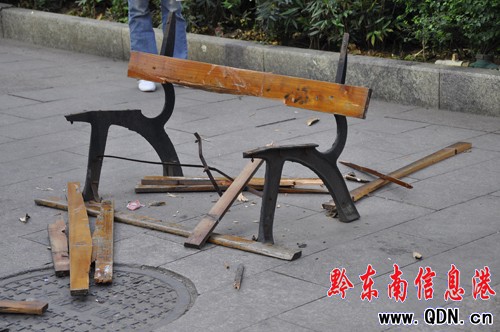 本港訊 (記者 楊驥 攝影報道)10月21日下午15時30分許,一男子大鬧凱里大十字,砸壞人行道上的木質椅子,威脅觀看的路人,還高呼:“你們拿我怎么搞!”聞訊趕來的大十字派出所民警經過一番折騰,才將男子制服。